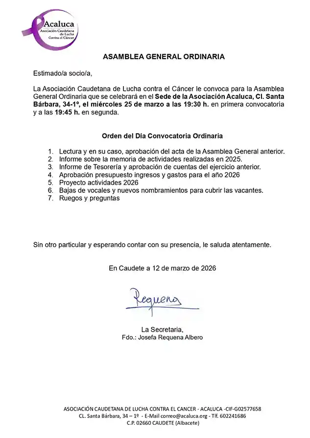 Desde la Junta Directiva de ACALUCA se informa a sus socios que el próximo jueves 12 de marzo de 2026 se celebrará nuestra Asamblea General Ordinaria.